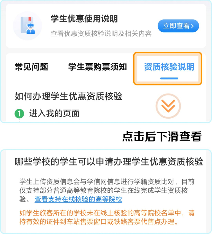 注意:如所在学校未在线上核验的高等院校名单中,请持有效的证件到车站窗口或自动售/取票机办理学生资质核验。