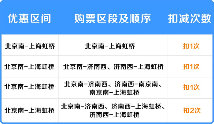 注意:购买联程车票时,需要确保购买区段的接续性,否则优惠次数按照购买车次数扣减。