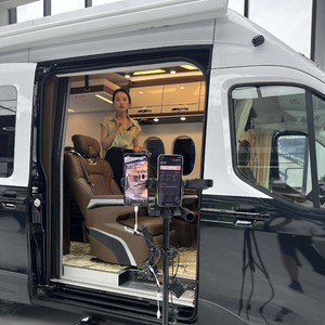“各位宝宝们,这是我们刚完工的全顺T6懒熊房车,整车经过保温隔音降噪处理,看这吊柜上的氛围灯,非常温馨……”发布会现场,公司主播走入房车内部,热情地讲解着新车型的各种设计和装置。