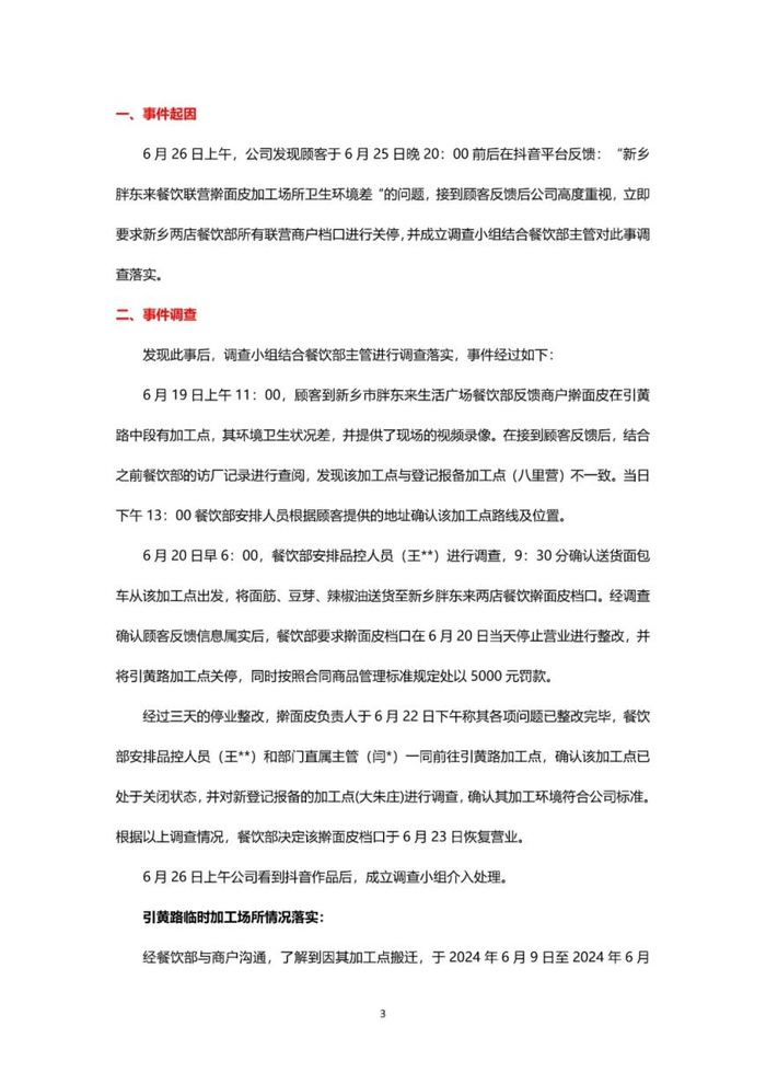 此前,有顾客于6月25日晚上在抖音平台反馈,新乡胖东来联营餐饮“擀面皮”加工场所卫生环境较差的问题。接到顾客反馈后,胖东来立即要求新乡两店餐饮部所有的联营商户档口进行关停,并成立调查小组结合餐饮部门主管对此事进行严格调查落实。