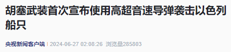 据央视新闻客户端消息,当地时间6月26日晚间,也门胡塞武装对外公布了此前袭击以色列船只“MSC SARAH V”号的视频画面,并表示使用了自主制造的新型高超音速导弹“哈蒂姆-2”完成了袭击。这是胡塞武装首次正式对外宣布拥有并使用了高超音速导弹。