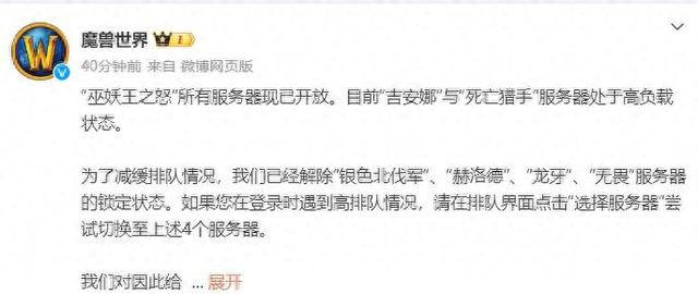 【环球网互娱综合报道】6月27日上午消息,知名游戏魔兽世界通过其官方微博宣布,“巫妖王之怒”版本的所有服务器现已全面开放。根据官方消息,目前“吉安娜”与“死亡猎手”两个新命名的服务器正处于高负载运转状态,显示出玩家对于新版本的热情与期待。
