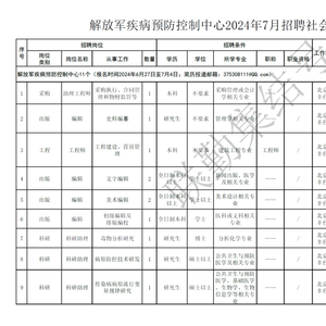 此次发布7月份中国人民解放军疾病预防控制中心社会人才招聘岗位计划11个:其中,采购1个、工程1个、出版6个、科研3个。