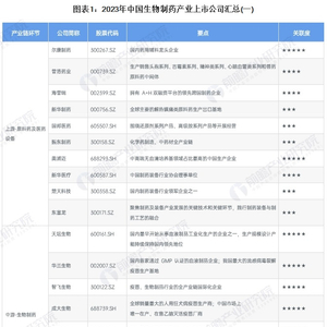 生物制药产业是生物经济的重要组成部分,上游行业原料药行业代表上市企业亿欧元尔康制药、普洛药业、海普瑞和新华制药等,上游培养基行业上市企业有奥浦迈等,上游医药装备行业上市企业新华医疗、楚天科技和东富龙等;中游生物制药行业上市企业有天坛生物、华兰生物、智飞生物、成大生物、康泰生物、沃森生物等;下游为医药流通企业,代表上市企业有九州通、大参林、益丰药房等,产业链上市企业汇总如下: