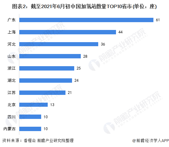 从全国各省市的氢能源基础设施建设中可以发现,广东省在氢能源的推广、建设上较为领先。截至2021年6月初,全国加氢站我国加氢站共建成141座,其中119座在运营,22座已建成。目前广东省已运营、已建成、在建及拟建的加氢站共61座,排名全国第一;上海44座,排名第二。