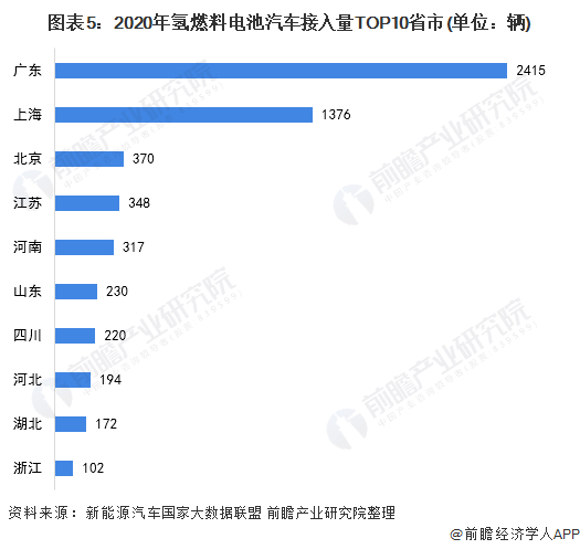 2020年,监管平台已累计接入氢燃料电池汽车6002辆。全国氢燃料电池汽车分布在17个省份,广东省接入氢燃料电池汽车2415辆,排在第一位。其次是上海市和北京市,氢燃料电池车辆接入量分别为1376辆和370辆;其他重点省份如江苏省、河南省、山东省、四川省、河北省、湖北省、浙江省,氢燃料电池汽车接入数量均在100辆以上。