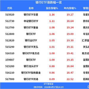 银行ETF华夏、鹏华基金中证银行ETF、南方基金银行ETF基金、华宝基金银行ETF、汇添富基金银行业ETF、银行ETF天弘、银行ETF易方达、富国基金银行ETF涨超1%。