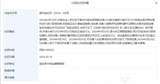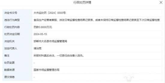 据天眼查显示,在今年5月15日,大名县好想来食品店因存在“食品生产经营者撕毁、涂改日常监督检查结果记录表,或者未保持日常监督检查结果记录表至下次日常监督检查”的行为,被邯郸市大名县市场监督管理局罚款8000元。