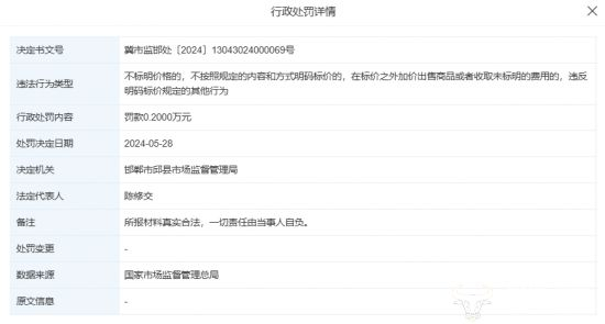 同月28日,邱县好想来零食综合门市因存在“不标明价格,不按照规定内容和方式明码标价的,在标价之外加价出售商品或者收取未标明的费用的,违反明码标价规定的其他行为”,被邯郸市邱县市场监督管理局罚款2000元。