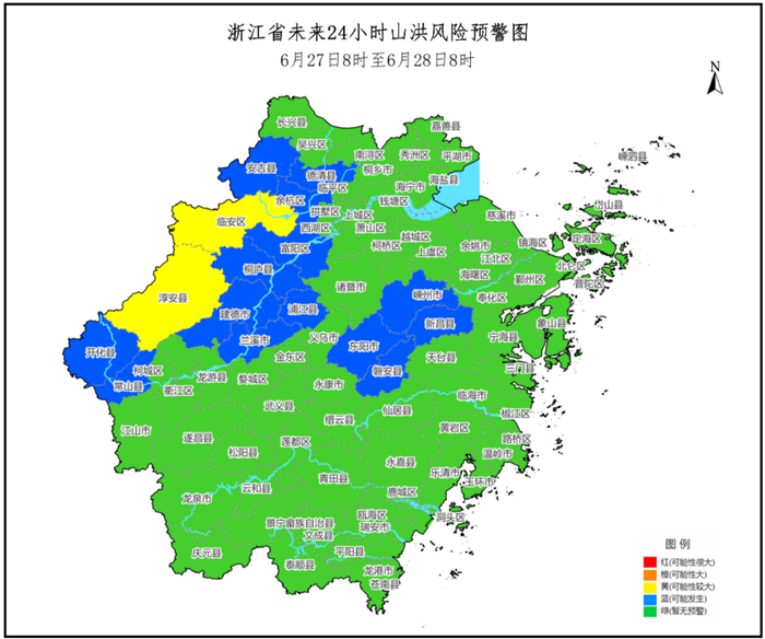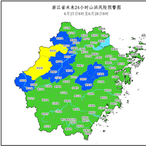 省水利厅、省气象局6月27日7时44分联合发布山洪灾害预警:根据省气象台未来降雨预报,预计6月27日8时至6月28日8时,临安区、淳安县发生山洪灾害可能性较大(黄色预警),余杭区、富阳区、桐庐县、建德市、德清县、安吉县、新昌县、嵊州市、浦江县、磐安县、兰溪市、东阳市、常山县、开化县可能发生山洪灾害(蓝色预警)。