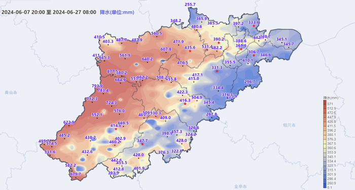 入梅至今,全市面雨量381毫米,最大淳安491毫米,其次是临安472毫米,主城区337毫米,有374站累计降水超过500毫米。