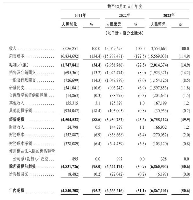 据合众新能源向港交所提交的申请材料,2023年营收135.55亿元,毛利亏损20.14亿元,累计亏损68.67亿元。