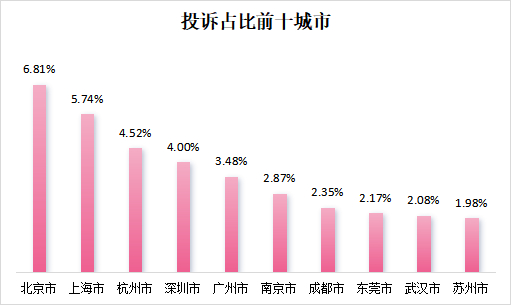在投诉人群地域分布上,小家电相关投诉中,深圳市的用户投诉量占比为4.00%,位列第四,北京市(6.81%)、上海市(5.74%)和杭州市(4.52%)包揽前三。