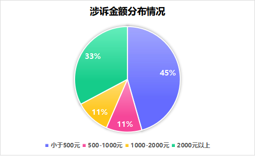 据涉诉金额分布情况,金额在500元以内的投诉占比最高,为45.59%;其次是金额大于2000元的投诉,占比为32.79%。