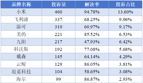 在投诉解决率方面,小米、海尔、云鲸、美的位居行业前列,投诉解决率均超80%,而九阳、追觅科技、添可、戴森等小家电品牌的投诉处理效率有待进一步提升。