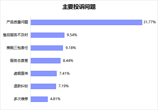 据统计,小家电的投诉问题主要集中在产品质量问题、售后服务不及时、推脱三包责任、服务态度差、虚假宣传等方面。其中,产品质量问题以31.77%的占比位居榜首,售后服务不及时占比为9.54%,排第二。