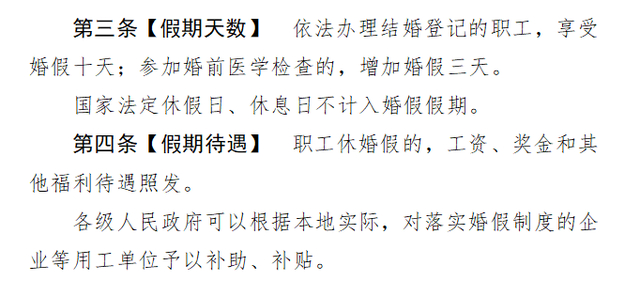 意见稿相关规定共有9条,其中第三条“假期天数”明确,依法办理结婚登记的职工,享受婚假十天;参加婚前医学检查的,增加婚假三天。