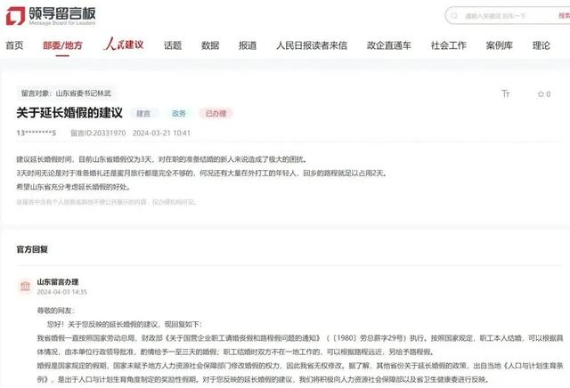 今年3月,有网友在“人民网领导留言板”呼吁延长婚假天数。该网友在留言中表示,目前山东省婚假仅3天,无论准备婚礼还是蜜月旅行都不够,在外打工的年轻人,回乡路程就占2天。