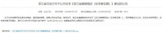 日前,浙江省司法厅发布公告,对《浙江省婚假规定(征求意见稿)》征求意见。