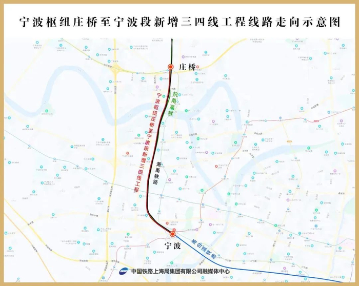 宁波枢纽庄桥至宁波段增建三四线工程,全长约7.4公里,设计时速120公里,自既有萧甬铁路庄桥站引出,沿既有铁路右侧跨过余姚江,途经江北区和海曙区,止于铁路宁波站。
