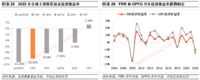 从最新业绩来看,受到2022年全球通胀水平攀升,资本市场股债双杀影响,虽然FRR投资组合中的非上市资产表现较好,但上市资产表现不佳,整体投资收益率-10.0%。从资产组合特征来看,对美欧市场股债资产的集中配置,一定程度上放大了FRR在本轮市场波动中遭受的冲击。从决策方向来看,近两年,FRR一方面增加了对ESG领域投资,另一方面加大了对日本权益市场的配置,上述变化预计将在新一年度业绩表现中有所体现。