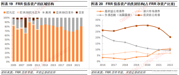 近年来,FRR债券资产占比在50%左右震荡,但结构上呈现风险偏好提升的态势。从区域来看,FRR的债券资产长期以欧美为主,在2011年之前还曾少部分配置在以日本为代表的亚洲国家;但2011年之后,债券资产则仅布局在欧元区与美国,比例分别为80.5%和19.5%。FRR的债券资产主要发挥风险对冲的作用,相对单一的区域结构能够降低投资管理的难度和成本。从债券资产的类别结构来看,FRR近年来偏好高收益债券,对法国国债、投资级公司债等低风险债券关注度有所下降。具体来看,自2016至2022年法国国债占FRR净资产比例已持续下降超10%,新兴市场债券占比相对较为稳定,投资级公司债近两年占比自30.3%下降至20.4%,而高收益公司债券在两年间从4.5%上升至10.4%,风险偏好整体呈现上升趋势。