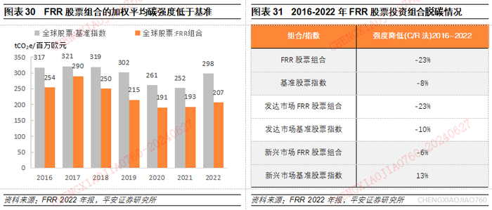 近两年,FRR投资组合中股权资产的排碳量较同类资产的基准指数更低,2016-2022年发达市场碳排放强度相较新兴市场下降幅度更大。对于股票投资组合,截至2022年底,FRR股票投资组合的加权平均碳强度(WACI)为207吨二氧化碳当量/百万欧元,较FRR全球股票基准指数的加权平均碳强度低31%。而从2016年到2022年,FRR全球股票基准指数的加权平均碳强度下降了6%,FRR投资组合的加权平均碳强度则下降了18%。据FRR 2022年度报告,FRR股票投资组合脱碳情况显著好于基准股票指数,2016-2022年FRR股票投资组合碳排放强度降低23%,基准股票指数仅下降8%。从不同市场来看,发达市场FRR股票投资组合脱碳情况优于新兴市场,碳排放强度下降幅度更大。