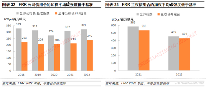 第三,FRR的ESG投资经验。FRR在ESG投资方面的经验体现在三点:一是ESG原则与国际接轨。FRR的责任投资原则与国际要求保持一致,并通过参与多项国际合作倡议增强与基金经理、投资公司合作,加强投资活动当中的ESG对话交流。在此基础上,FRR每五年制定和更新ESG投资策略,确保ESG策略的与时俱进。二是ESG投资范围的限制。考虑到ESG投资在发达市场与新兴市场普及的程度不同,FRR目前主要在发达经济体的股票投资中实施ESG策略,这既能够确保投资组合将ESG因素充分纳入考虑,又能够使得新兴市场投资不受到过多限制。三是量化ESG效果。FRR测量并披露投资组合的碳足迹,其明显低于同类资产基准指数的碳足迹,能够更加直观地显示其ESG投资策略对脱碳目标的贡献。