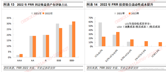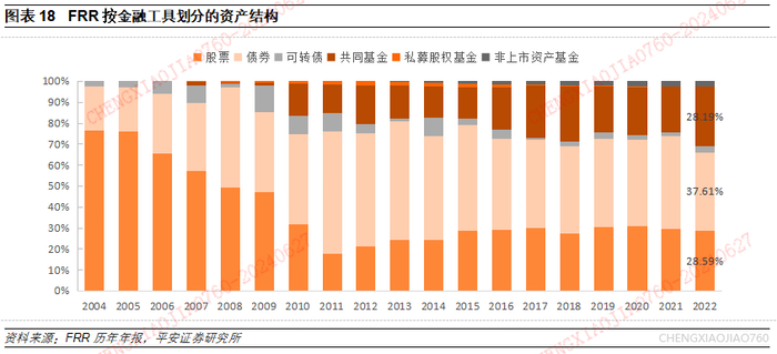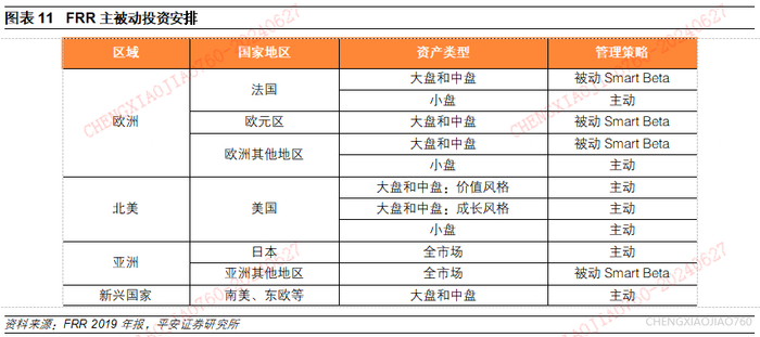 FRR选择主被动相结合的投资模式。其中,被动投资主要适用于相对成熟的市场,因此其主要标的是发达市场的大盘和中盘股票,采用了非市值加权的“聪明贝塔(Smart Beta)”指数来进行管理,其从中长期看能够跑赢标准市值加权的指数。主动投资则更多适用于新兴市场、具有较高风险的组合,主要标的包括新兴市场债券、新兴市场股票、高收益公司债、非上市资产等。截至2022年12月31日,FRR净资产的59%和股权投资的65%选取了主动投资的模式。