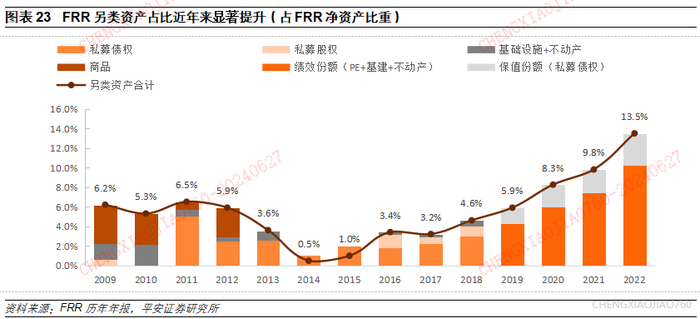 近年来,FRR对另类资产的关注度显著提升,资产类别扩充至私募股权资产,投资类别结构均衡性更强。2004年至今,FRR另类资产的配置大致经历了三个阶段的变化,资产占比有显著波动,资产类别结构也发生了切换:①2010年改革之前,另类资产占比大体在5%-6%的水平,结构上主要包括基础设施、不动产和大宗商品,其中大宗商品占另类资产比例过半;②2010年改革之后,另类资产占比逐步下降,到2014年占比低至0.5%,且结构上以私募债权为主,商品、基础设施和不动产均逐步减配,体现出明显的风险厌恶特征;③2014年之后,由于上市资产的处置和市场波动造成的减值,上市资产净值减少明显,另类资产占比逐步提升,且新增了私募股权资产,基础设施和不动产也再度纳入配置,另类资产投资结构更为均衡。