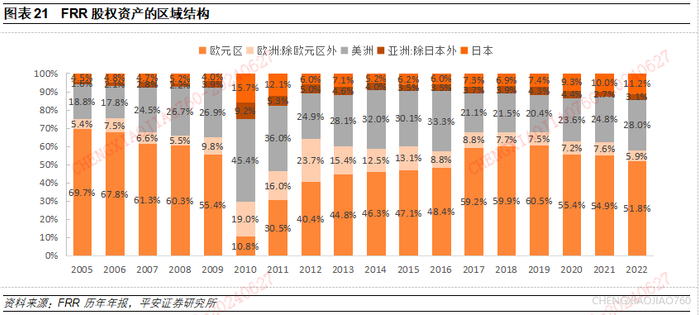 FRR资产配置主要包含债券投资、股权投资以及另类资产投资三类。其一,近年债券投资仅配置欧美市场,结构上呈现风险偏好提升态势,高收益公司债券占FRR净资产比重增长明显。其二,股权投资占比稳定在40%左右,布局以欧美日为主,较为偏好发达经济体,各行业分布相对均衡,工业&制造业、金融、消费品&日用品、消费服务、健康行业占比居前五位。其三,FRR近年对另类资产的关注度显著提升,资产类别扩充至私募股权资产,投资类别结构均衡性更强。从收益贡献来看,非上市资产表现具有时滞性和平稳性,难以及时反映上市资产市场表现,构成了对2022年FRR业绩的主要贡献。