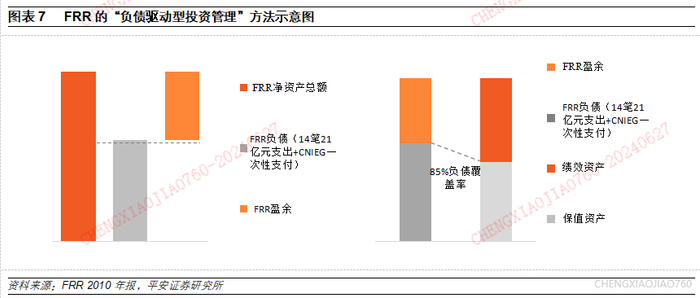 3)投资组合:FRR在甄选专业资产管理机构委托管理模式下,将资产组合分为保值资产组合和绩效资产组合两大类,其中,保值资产组合的主要任务是确保FRR满足计划中的支出,初始按照85%的负债覆盖率确定保值组合的资产分配规模(负债覆盖率随时间调整);绩效资产组合的主要任务则是获取绝对回报。