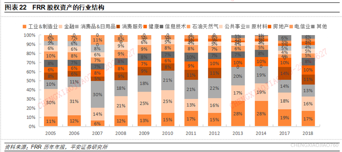 近年来,FRR股权资产稳定在40%左右,布局偏好发达经济体,各行业分布相对均衡。从区域来看,FRR的股权资产主要布局在发达经济体,欧元区资产占比最高,占比普遍过半;美国次之,占比约30%左右;日本第三,欧亚其他经济体也有一定配置。如果通过币种结构进一步细化观察,可以看到排名前三的是欧元、美元和日元资产,英镑、澳元、港币和瑞典克朗紧随其后。从行业来看,股权投资的行业分布呈现多样化特征。行业占比排名靠前的分别是:工业和制造业、金融业、消费和日用品、消费服务、医疗健康、信息技术。从变化趋势来看,2005年至2018年,工业和制造业、消费、医疗健康的占比有所抬升,而金融业、石油和天然气的占比则有所下降。
