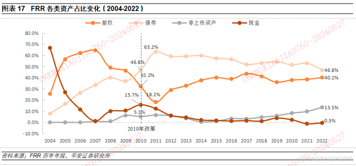 各类资产的变化大致可概括为三个阶段:①2010年改革之前,FRR各类资产占比波动较大,且大体呈现出股权资产占比下降、债券、另类和现金资产占比提升的态势,其中,股权资产占比在此期间的显著下降,与2008年金融危机冲击的应对有关。②2010年改革的次年,由于FRR面临支付压力并开始采取“负债驱动型”投资管理方法,其债券资产占比进一步提升至63.2%的高位,股权资产则降至18.2%的低位,整体表现出风险偏好下降的特征;同时现金占比下降,也体现出对绝对收益的追求。③2011年之后,FRR各类资产的占比变化更加平缓,整体呈现股权资产占比提升、债券资产占比下降、另类资产占比提升的趋势。截至2022年,FRR非上市资产投资占比已达到13.5%,股债投资占比也进一步缩小。