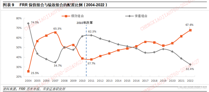 从组合比例来看,自2004年至今,绩效组合与保值组合的比例每年都在发生变化,FRR明显提升其对绩效资产组合的关注度。自2010年FRR改革之后,绩效组合占比就整体呈现上升趋势,从2011年的37.7%升至2022年的67.6%;而保值组合的占比则从62.3%逐步降至32.4%。随着基金支付压力的逐渐减轻,保值组合覆盖负债的压力也在逐步减小(因此其比例逐步下降),FRR整体呈现出对投资收益要求提高、风险偏好逐步提升的特征。