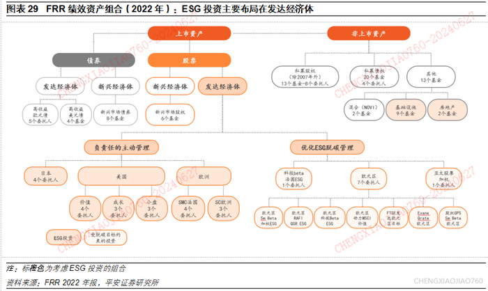 值得一提的是,FRR考虑到ESG投资在发达市场与新兴市场普及的程度不同,FRR目前主要在发达经济体的股票投资中实施ESG策略,这既能够确保投资组合将ESG因素充分纳入考虑,又能够使得新兴市场投资不受到过多限制。以2022年的绩效资产组合为例,FRR在发达经济体的股票投资当中,重点布局了两大类考虑ESG投资的组合,一是负责任主动管理(Responsible active management)组合,主要分布在美国、欧洲和日本;二是优化ESG脱碳管理(Optimised ESG decarbonisation management)组合,主要分布在法国、欧洲其他地区和亚太地区。