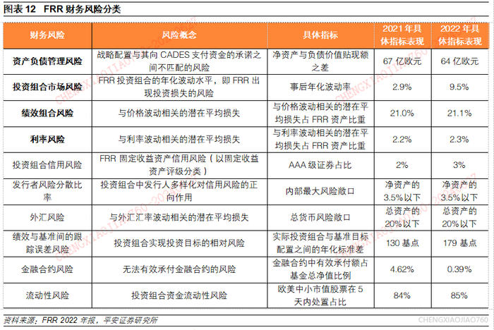 投资管理:从运营管理看,FRR总体由监事会领导,监事会下包含管理人甄选委员会、执行委员会以及内部会计委员会三部分,其中执行委员会为主要核心。从投资管理看,FRR在2010年改革之后成为典型的“负债驱动型”养老基金,以应对持续的资金支付需求。其采取委外为主+主被动结合的投资管理方式,资产组合主要分为保值组合和绩效组合两类,近年来保值组合占比下降明显。从风险管理看,FRR致力于确保资产组合及其战略配置实现高水平的负债覆盖率,将其面临的风险分为财务风险、非财务风险、操作风险、健康危机、合规风险等五方面。