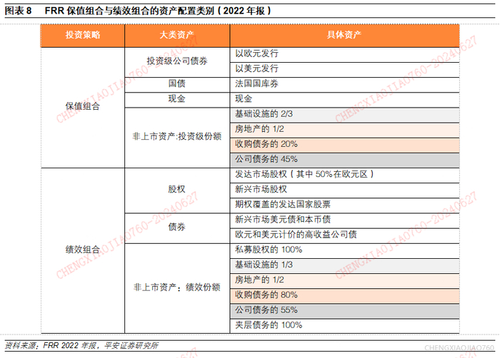 值得一提的是,FRR两种组合及其资产配置要求随时间发展而变化。从资产类别来看,2009年FRR首次在年报中披露两类组合时,绩效组合包括所有股权资产、大宗商品和不动产,保值组合则仅包括各类债券和现金。此后,两类组合的资产逐步呈现多样化的特征,其调整包括:资产种类划分逐步细化,绩效组合中逐步增加高收益债券,并在两类组合中引入非上市资产,其中包括基础设施、房地产、收购债务、公司债务等。如下所示,从2022年报中非上市资产配置类别来看,基础设施的2/3、房地产的1/2、收购债务的20%以及公司债务的45%被归类于保值组合,基础设施的1/3、房地产的1/2、收购债务的80%、公司债务的55%、私募股权以及夹层债务被归类于绩效组合。