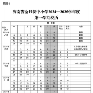 最新校历还明确了海南省中小学明年寒暑假时间。其中,义务教育阶段学校2025年1月11日放寒假,7月5日放暑假;普通高中学校2025年1月18日放寒假,7月12日放暑假。