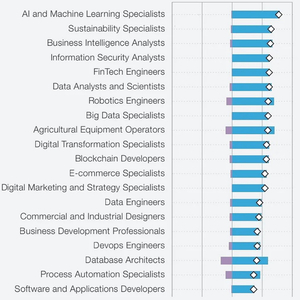该报告涵盖的803家全球企业中,超过75%的企业表示将在未来五年内广泛采用大数据、云计算和人工智能等先进技术。根据预测,到2027年,数据分析师、大数据专家、人工智能和机器学习专家等从业者工作机会将平均增长30%。