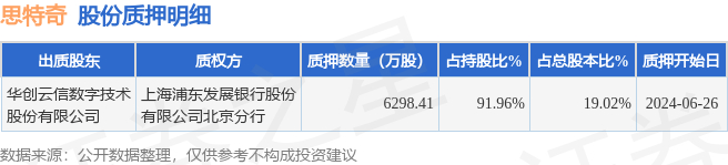 思特奇(300608)股东华创云信数字技术股份有限公司质押6298.41万股,占总股本19.02%