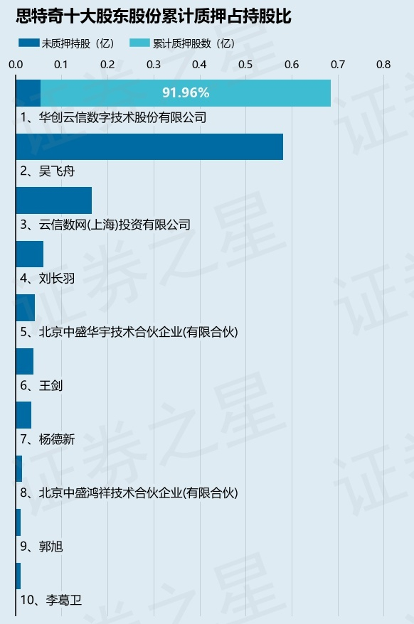 截止本公告日,股东华创云信数字技术股份有限公司已累计质押股份6298.41万股,占其持股总数的91.96%。本次质押后思特奇十大股东的累计质押股份占持股比例(占持股比例的计算以公司最新一期财务报表公布的十大股东的持股总数为基准)见下图: