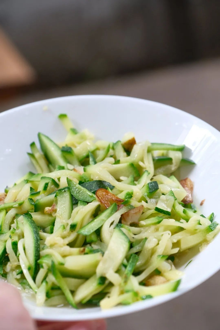 小南瓜嫩,不用削皮,直接切成丝,放盐,把水分挤干。热油,烧热了下锅,搁点味精就可以,因为之前放了盐,就不用再放盐了。