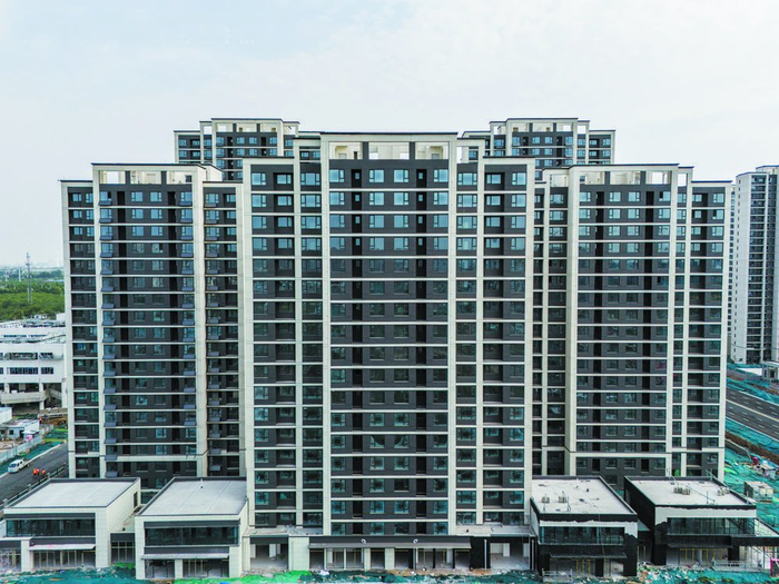 “21号楼,室内吊顶完成100%,顶棚粉刷石膏完成100%,墙面顶棚腻子完成100%……厨房橱柜完成100%,淋浴房完成100%……”