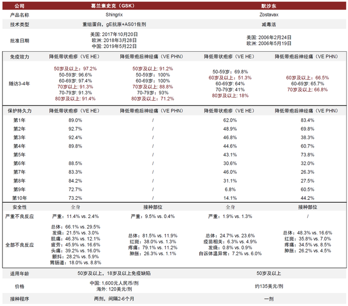 资料来源:Oxman, M N et al. “A vaccine to prevent herpes zoster and postherpetic neuralgia in older adults.” The New England journal of medicine vol. 352,22 (2005): 2271-84. doi:10.1056/NEJMoa051016, Lal, Himal et al. “Efficacy of an adjuvanted herpes zoster subunit vaccine in older adults.” The New England journal of medicine vol. 372,22 (2015): 2087-96. doi:10.1056/NEJMoa1501184,中金公司研究部
