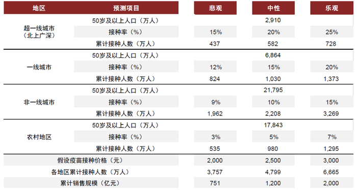 图表:中国50岁及以上人群带状疱疹疫苗市场规模敏感性测算