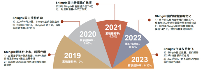 自2024年起,智飞独家代理Shingrix,有望明显加速Shingrix国内放量。根据该协议,GSK将向智飞独家供应Shingrix,并许可智飞根据约定在中国大陆地区营销、推广、进口并销售相关产品,协议期截至2026年底,其中2024/2025/2026年该疫苗最低采购金额分别为34.4亿/68.8亿/103.2亿元,总计206.4亿元,该最低采购金额主要确保代理产品的基础供应,双方将根据市场实际情况协商调整实际采购量。据智飞和GSK公告,截至2023年底,智飞生物销售人员达3,990人,覆盖中国3万多个接种点,为Shingrix的市场推广提供了充足的人力保障,我们预计有望明显加速Shingrix国内推广进度。若假设采购价占终端价格的比例为60%,且每年约定采购的Shingrix实现完全接种,我们测算得Shingrix 2024-2026年国内当年接种率分别为0.4%、0.7%和1.1%,较2023年前放量明显提速。