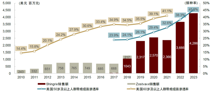 图表:Shingrix、Zostavax全球销售额以及美国带状疱疹疫苗接种率(2010-2023)