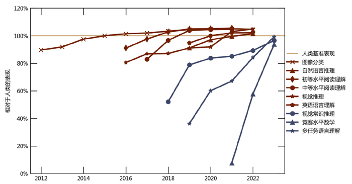 注:多任务语言理解,简称MTLU,是指通过单一模型同时完成多种自然语言处理任务。图中所示的AI表现并非指某种特定AI模型的表现,也并非都是大语言模型,而是指在这一任务上,表现最佳的AI模型的得分,其中不乏有为某任务专门进行人工干预和训练的AI。比如视觉常识推理类任务表现较好的AI是ViLBERT、GPT-4RoI等模型,初级阅读理解上表现较好的是ANNA等模型。