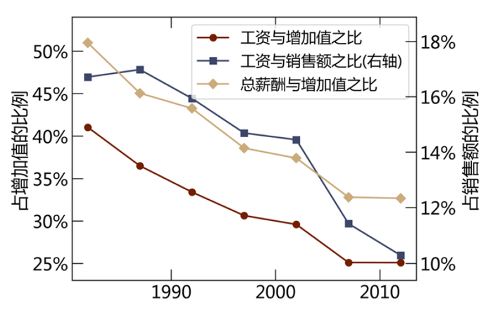 注:图表为美国制造业中劳动收入份额的三种衡量标准。